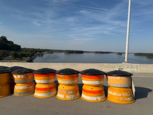 The highway is being resurfaced for a few miles. We waited a short time for the pilot car. As we passed the flagger she blew bubbles.