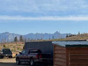 We filled the car with gas and stopped at the grocery store for salad mix in Dubois. Our lodging is in a cabin out of Dubois. A few miles out of town we turned off the highway onto a dirt road. We drove five miles on a good gravel road that twisted and turned its way up the mountain. Several switch back turns kept us from going very fast. Numerous big log homes are all along the road. We finally got to Crooked Creek Cabins. Quite a complex. They have a restaurant, RV park, rental cabins and rental outdoor equipment. The cabins are made of logs with metal roofs. They must have different configurations because they aren’t all the same size. The restaurant seems busy and four wheelers are driving all over.