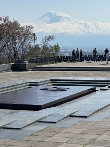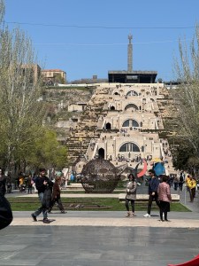 From here we walked down the street a few blocks and around the corner to see the Cascade. The idea for the Cascade first appeared in the master plan for Yerevan, developed by architect Alexander Tamanian in the 1920s. He envisioned connecting the city center with the northern hills of Kanaker through a system of terraces, waterfalls, and flower beds. However, at the time, the project was deemed too ambitious and did not receive funding. It is still not totally completed but is a very popular place to visit. There are 600 steps to reach the top. Thank goodness we took the seven escalators instead. The view at the top was beautiful. The city stretches out before you with Mount Ararat in the distance. We were very fortunate to see it today. It is often in the clouds. The mountain is actually in Turkey. It is most known as the mountain where Noah’s Ark landed. The mountain actually consists of a very large peak and a smaller one to the side. Both are snow covered. The mountain is very important to the Armenian people so they are not happy it is now a part of Turkey.