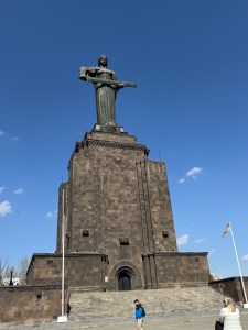 We drove some through the city and up the hill to the statue of Mother Armenia. The roads are mostly very small. Intersections have streets coming from multiple directions. Cars park along the sides making the roads even smaller. The drivers are crazy. They drive all over the road. Hard to believe there aren’t more wrecks. We got to the top with another view of the city. An eternal flame burns here commemorating lives lost during World War II. The statue was originally of Stalin. That statue was removed in 1962. In 1967 the Mother Armenia statue was erected. The statue is 72 feet tall and the pedestal is 95 feet for a total of 167 feet.