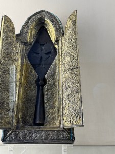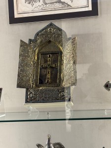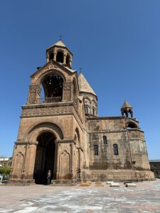 After lunch we visited Etchmiadzin Cathedral which is the mother church of the Armenian Apostolic Church. It was built between 301 and 303 by Armenia’s patron saint Gregory the Illuminator. The cathedral is located in the administrative headquarters of the Armenian Apostolic Church. Within the grounds is a school and seminary. In another building baptisms are performed. Numerous people were there dressed very nicely for baptisms. Inside the cathedral Is the treasury where numerous significant items are kept. Two of these are a piece of Noah’s Ark and the sword that pierced Jesus’s side.