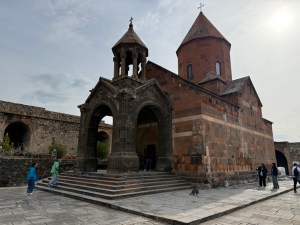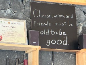 Off we go for a wine and cheese tasting. The valley has lots of vineyards. The view of Mount Ararat is impressive. We have been very lucky to see it so well. We arrived at a small family run cheese producer. They must not be too small because they produce 23 kinds of cheese and sell to numerous Armenian stores plus export to California. By the way the Los Angeles area has a very large Armenian population. They have purchased wine locally so we get some of each. The cheese is mild compared to some countries but delicious. We especially liked the one with dill. We also got a glimpse inside their cheese factory. It wasn’t running today unfortunately. They only make one kind of cheese on a given day. The type depends on the makeup of the milk they receive. Yesterday they also sold all the cheese they had made. They have a small orchard on the property too.