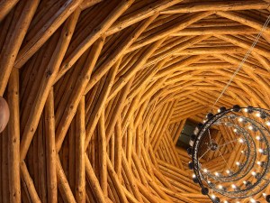 Lunch was bbq chicken that was really smokey. They put the pieces on a stick and place it in the wood oven that is also used to make bread. Connie would liked to have eaten much more but she was too full. The roof of the dining room was criss crossed logs giving a very unique look.
