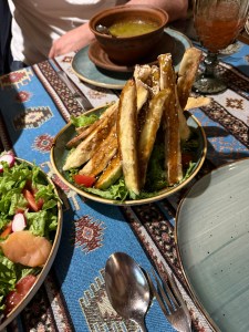 We offered to take the guys to lunch. The guide and driver had quite a discussion where to go but came up with one. We were let out and the driver would park the car. Not sure where because space is a premium. We had crispy eggplant which is the best eggplant I have ever had and two meat dishes. One was done with cherries and one with chestnuts. We had a tropical fruit lemonade that was delicious.