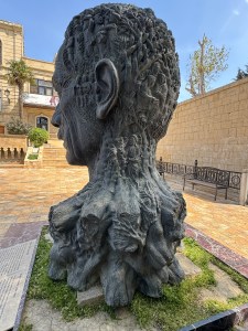 One of the metro stations is nearby and looks like the glass pyramid outside the Lourve in Paris. There is also a funicular nearby. A little further along is a bronze head of another important person. The hair is actually scenes of people.