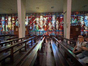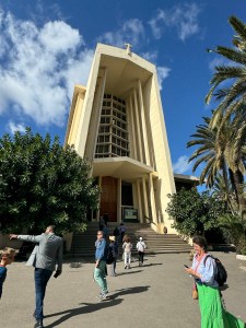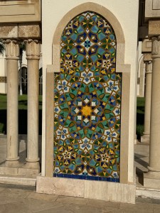 Casablanca is a big city of about 4.5 million residents. Lots of industry and commerce. Very little of historical significance. It sits on the Atlantic Ocean and has a large seaport. A big cruise ship was in the port. Most of the city tour was done on the bus. Just as well since traffic was terrible. Many of the streets are narrow especially when buses are trying to pass in opposite directions. We did make a stop at the Lady of Lourdes Catholic Cathedral. Mass is held here on Sundays.