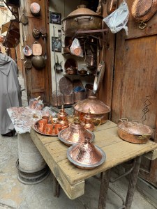 Lots of shops are open for business. We saw lots of spices and food items. Many of the sweets are made at home and then brought to the shop. One business was selling fresh camel meat. Other shops sold beef jerky, Fez hats, clothing, lamps, copper pots, wood decorations, honey cakes, leather products and too many other items to mention.