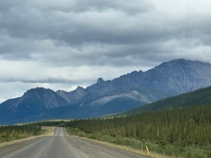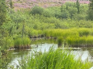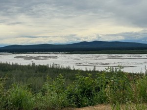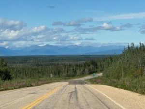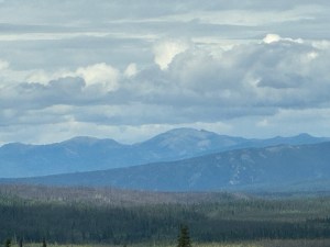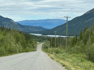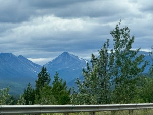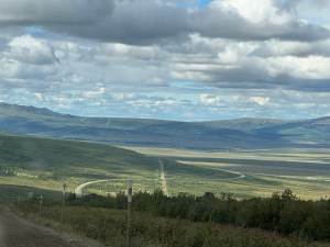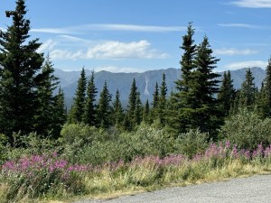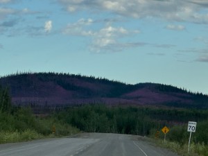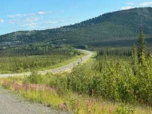The terrain has been changing significantly. We have gone through forest with stunted trees and then tundra. One area had a forest fire go through. The ground was once again covered with the raspberry flowers. Learned later that those are called fireweed.