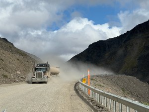 At one point a lead car for a large truck stopped us and suggested that we wait because the truck that was coming was quite long and quite wide. So we turned off the car and just sat there. Sure enough it was a long wide truck that came. Glad that we stopped.
