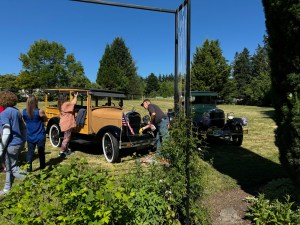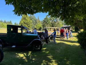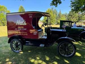 Then it was time to decorate the cars for the Spofford neighborhood parade. Granddaughter Madeleine and her boyfriend Jake arrived just in time to ride in the car. Connie stayed behind because she rides in the car often enough. At the house everything except the water fountain was quiet. It was so peaceful. The gang returned and a few more showed up. All of a sudden it was lunch time. We had terrific sandwich materials, chips, peas and watermelon.