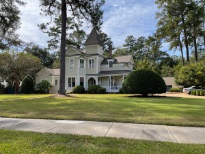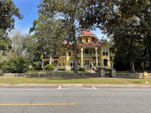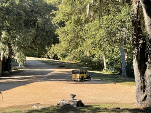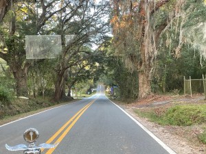 So off we go. Whoever did the route did a good job of keeping us off the busy streets. We did during the day go over many of the same streets multiple times. The route takes us along narrow two lane roads that everyone forgot to paint lines. Many of them have canopies of tree branches. Lots of the oak trees have Spanish moss hanging from them. Gives them a rather eerie appearance. Quite a few homes have Halloween decorations out. The terrain is a combination of forest, big lavish homes with huge lawns and small homes with small yards. Occasionally we see a pasture with horses, donkeys, cattle or goats.