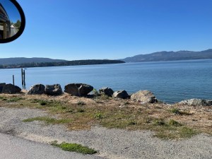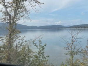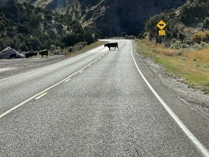 Then we headed out of town via Highway 30. This took us past Utah State University and through a narrow canyon. The wind was terrible. Even worse than yesterday. A couple of gusts blew us part way into the opposite lane. Good thing traffic wasn’t coming. The canyon however was beautiful. A small stream runs along side the road and steep mountains go up on both sides. The deciduous trees are bright reds and golds. Numerous cars are parked in areas that look like trail heads. The road twists and turns but doesn’t climb for quite a ways. Occasionally a passing lane is available. If not Rob tries to pull over to let traffic pass.