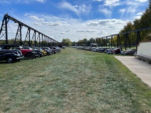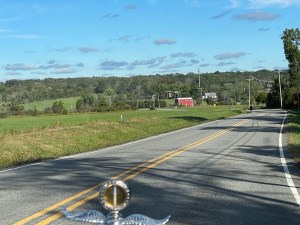 Today is sunny but cool. We still got a later start but decided not to go as far. Rob also decided to order a new radiator from Snyder’s Antique Auto Parts and have it shipped to his daughter Shelley’s house. That will be our next stop. That way he can replace the radiator. He added water before we left and filled the water cans. He adds about a gallon every time. The car started again without help and we are off. We took all back roads and the drive was beautiful. More small towns with houses sitting only a few feet from the edge of the road. Halloween is very evident based on the house decorations. Some of the places are covered with lights and blow up figures. Two neighboring towns had pink flags and ribbons honoring breast cancer awareness month. The streets of those two towns were lined with the flags. Fall festivals and special dinners were advertised in most of the towns. More road kill was along the road. At least four deer and two skunks. Thankfully we did not see any live animals on the road. One of the carcasses was being consumed by a pair of small vultures. We stopped more frequently today to add gas and water. We had a pizza for lunch at a local pizza parlor. Almost all of the trip was on scenic byways. Traffic is much lighter on these roads as well. Not as many farms today. Stopped to add water and found out that the radiator Rob ordered is out of stock. The phone call this morning said they had nine. Rob called and they said they were out of the one he ordered but they had nine of the cheaper ones. After some discussion they cancelled the one radiator and ordered the other to be shipped to Shelley’s by Wednesday. Sure hope that all works out. We got to our hotel before five pm so its still light. Great improvement. We went to the grocery store to get food for supper and breakfast. It happened to be a Kroger with gas pumps. We got ten cents a gallon off. That made the price $3.259 a gallon.