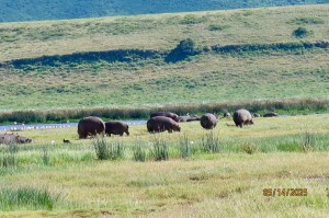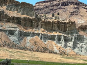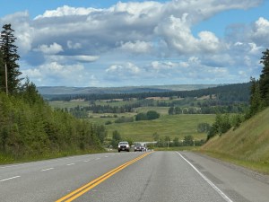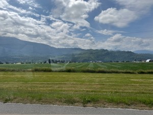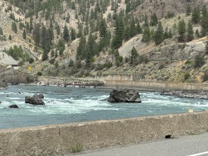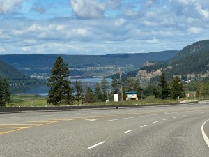 It’s cloudy again today but no rain until we got to Prince George. The landscape is mountainous with lots of evergreen trees. Some open areas have grass fields some with cattle. We also passed several lakes to include Lac La Hache, Williams Lake (just like a mirror), and McLeese Lake. Lots of recreation activities surrounding them. The hills are covered with a bright yellow daisy like flower.