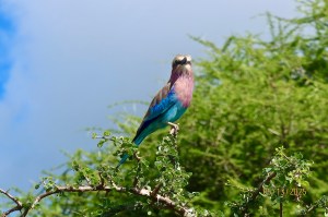 A colorful bird is in one of the trees. It maybe the national bird of one of the other African countries.