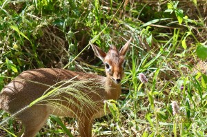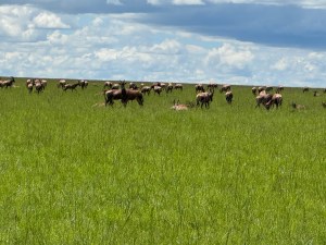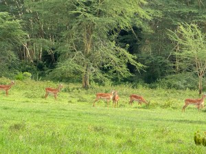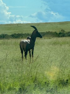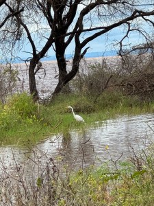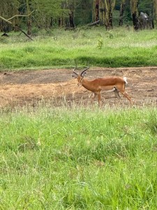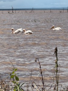 We came to the lake. The water is quite high since this is the end of the rainy season. Lots of ripples in the water even though we don’t feel the wind. The water is coming further onto the shore and killing some of the plant life. The lake is home to many kinds of waterfowl. The grassy areas nearby support the antelope population.