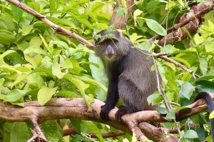 A monkey is sitting in one of the trees. Good thing our guide is accustomed to spotting them. They just look like part of the tree.