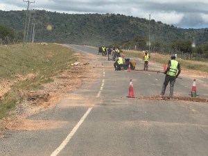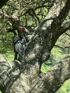 Further down the road is a large black bird with red on its face. It has a large beak. I think it is called a southern ground hornbill. They are found only in Southern Africa. They can live to be 50-60 years of age.